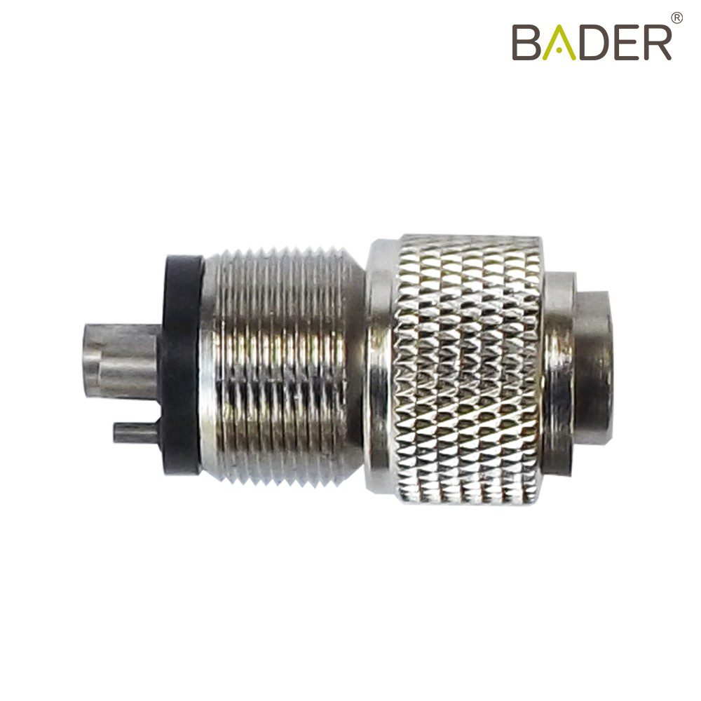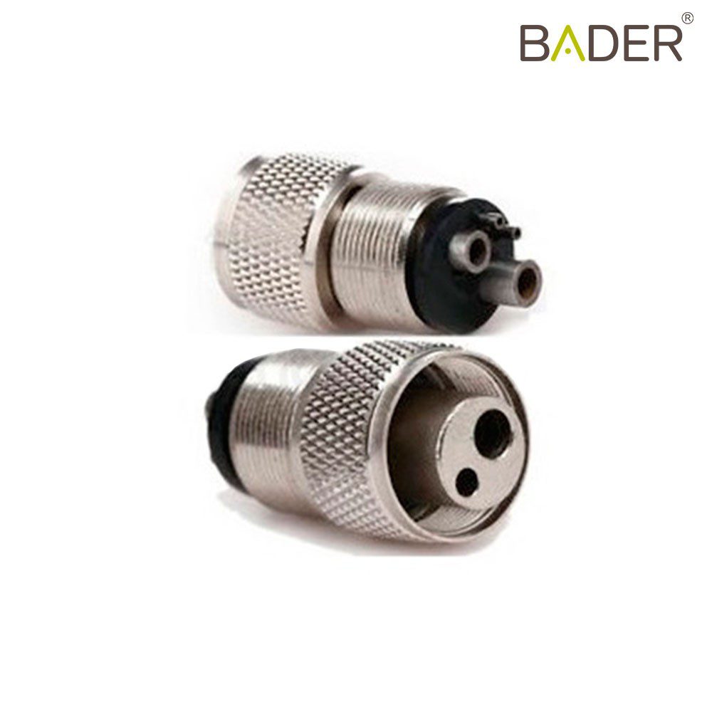 El adaptador Midwest/Borden de Bader permite acoplar turbinas o micromotores con conexión Borden (2 salidas) a mangueras con conexión Midwest (4 salidas).