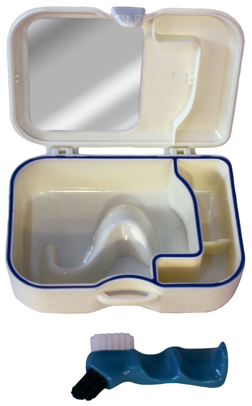 Caja porta-prótesis dental con compartimento para colocar un pequeño cepillo y un espejo (incorporados) que facilitan la colocación de la prótesis.