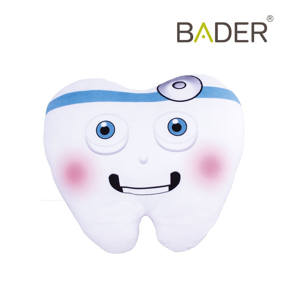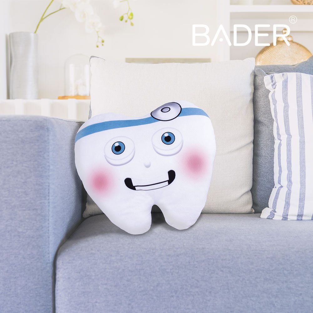 Cojín con forma de diente. Muy suave al tacto, tipo peluche. Es ideal para decorar la sala de espera de tu clínica dental.