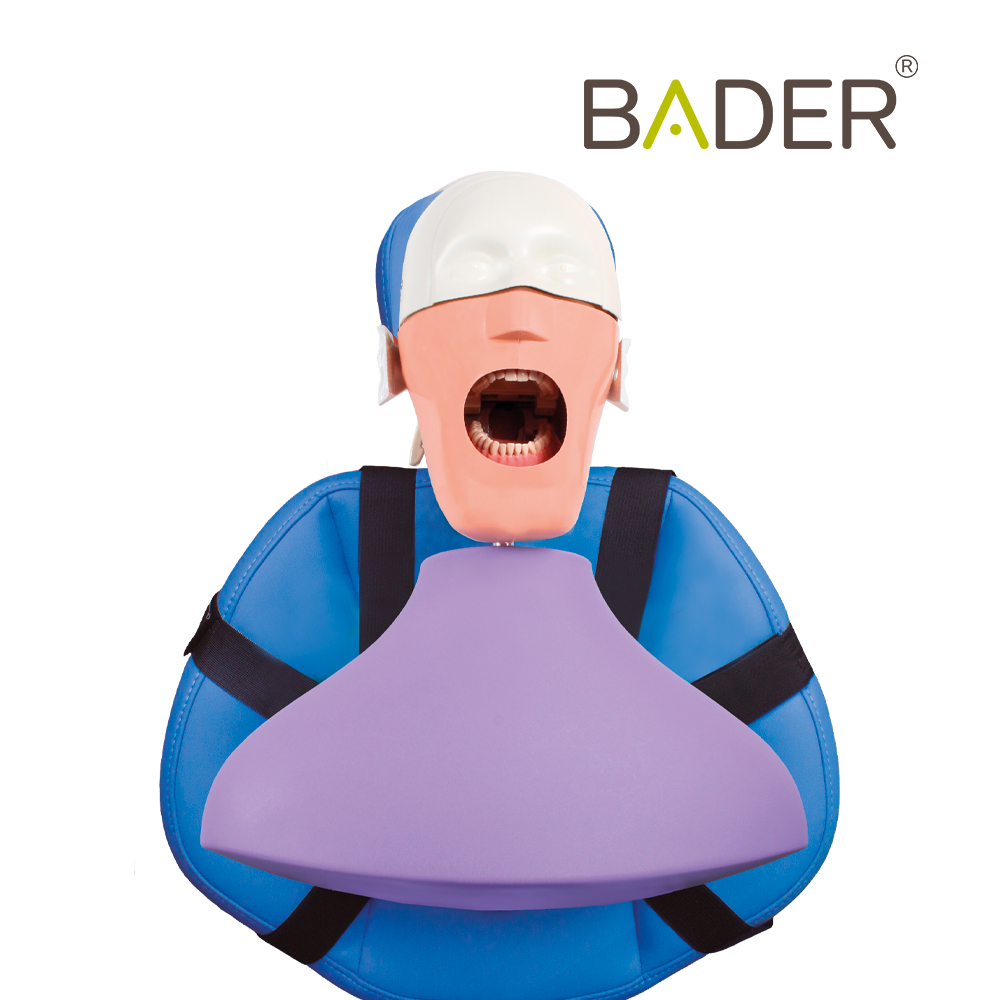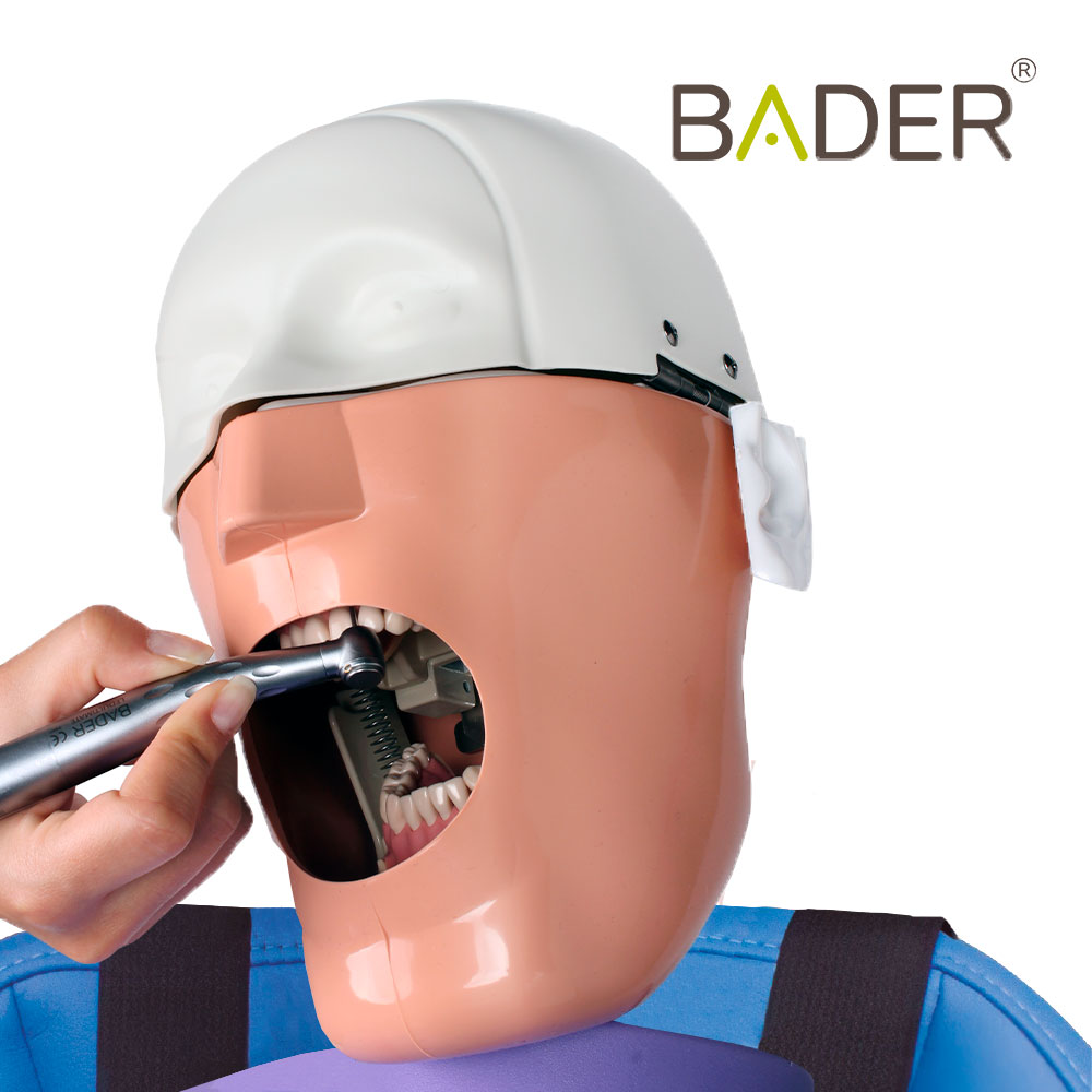 • El fantoma dental maniquí completo de BADER está compuesto de una máscara que cubre toda la cavidad facial fabricada de PVC siliconado, así se podrá tener una visión más real del modelo de estudio en el que se está trabajando.