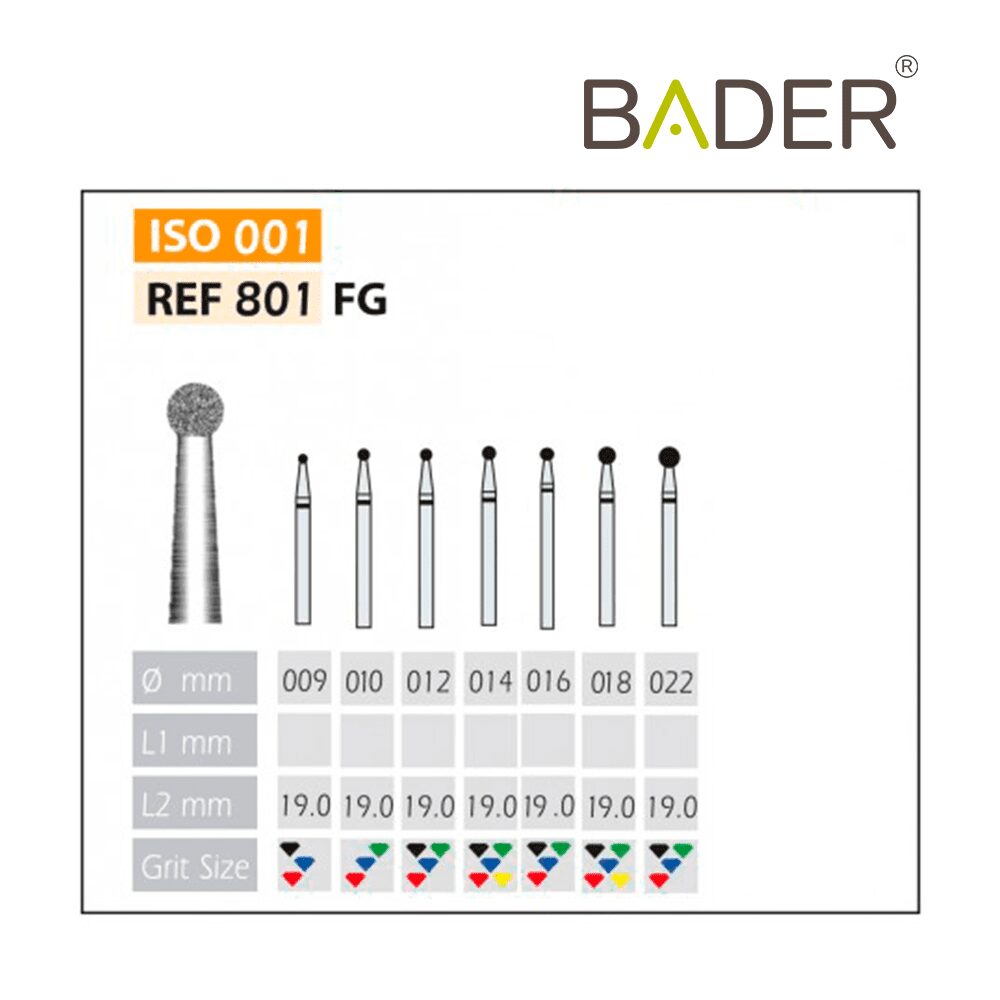 La rugosidad o el tamaño del grano de la cabeza. Es importante que al realizar su pedido nos indique el tipo de grano que desea.El tipo de rugosidad puede identificarse por el color de la fresa dental. La clasificación de rugosidades de las fresas dentales es también standard y estas son las que Bader tiene disponibles: