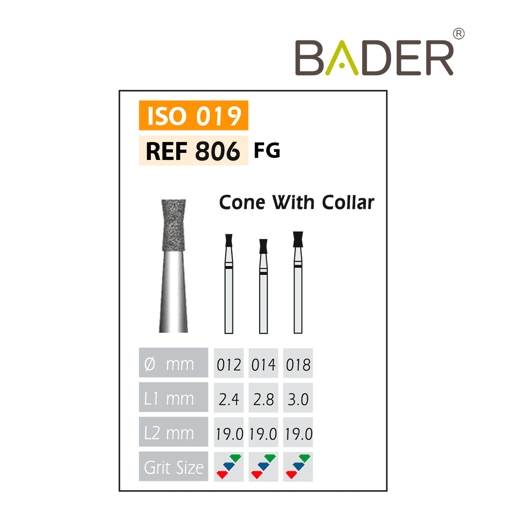 La rugosidad o el tamaño del grano de la cabeza. Es importante que al realizar su pedido nos indique el tipo de grano que desea.El tipo de rugosidad puede identificarse por el color de la fresa dental. La clasificación de rugosidades de las fresas dentales es también standard y estas son las que Bader tiene disponibles:
