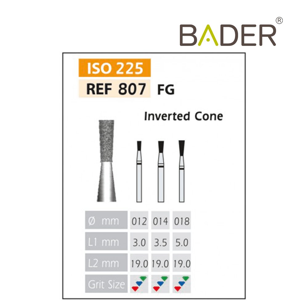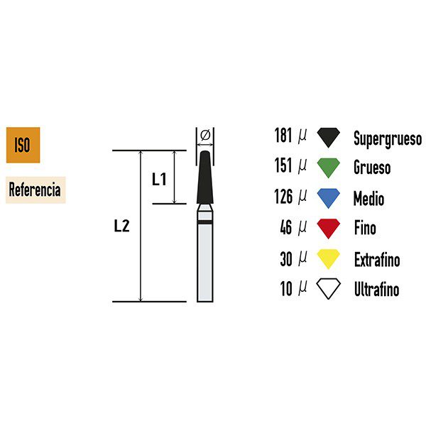 La rugosidad o el tamaño del grano de la cabeza. Es importante que al realizar su pedido nos indique el tipo de grano que desea.El tipo de rugosidad puede identificarse por el color de la fresa dental. La clasificación de rugosidades de las fresas dentales es también standard y estas son las que Bader tiene disponibles: