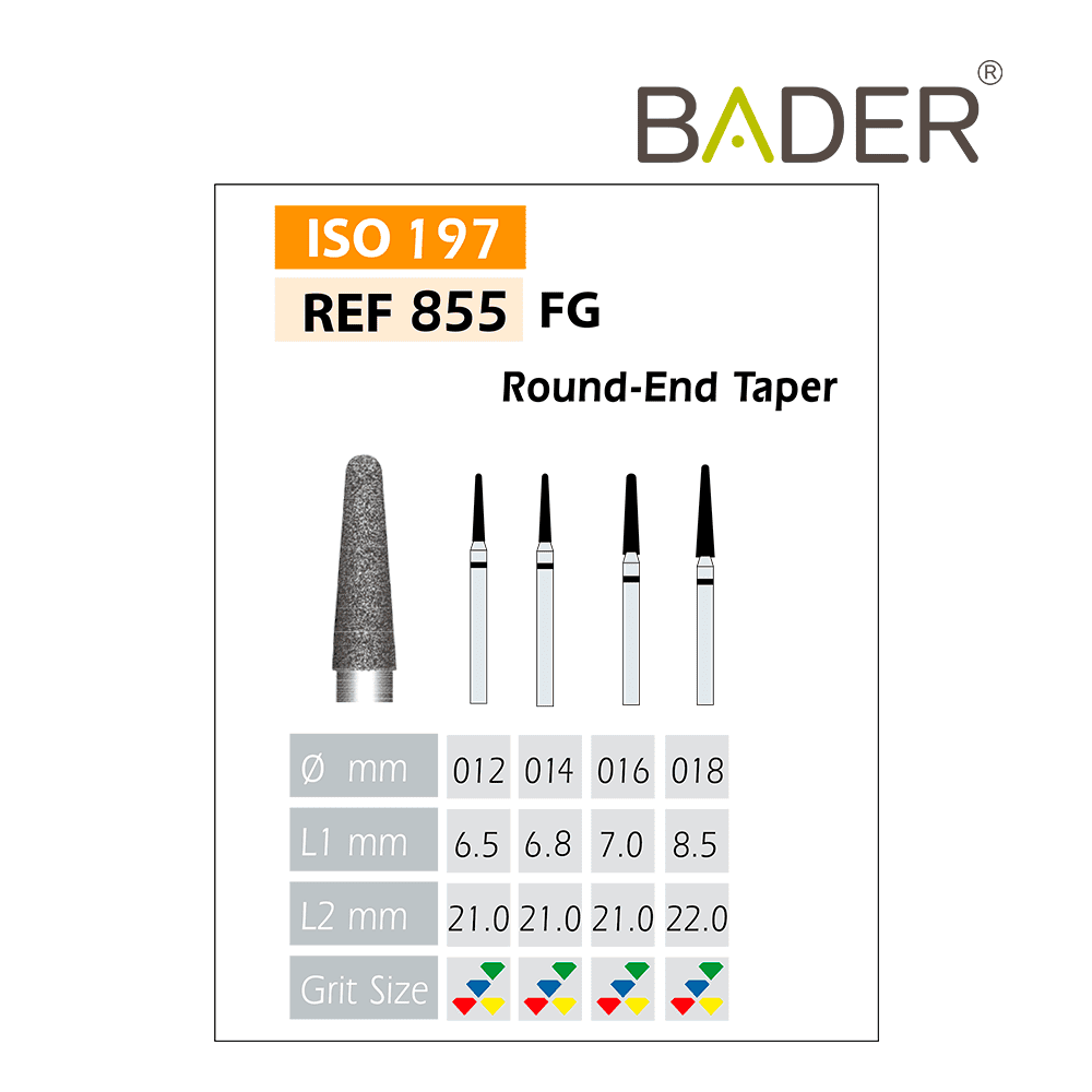 La rugosidad o el tamaño del grano de la cabeza. Es importante que al realizar su pedido nos indique el tipo de grano que desea.El tipo de rugosidad puede identificarse por el color de la fresa dental. La clasificación de rugosidades de las fresas dentales es también standard y estas son las que Bader tiene disponibles: