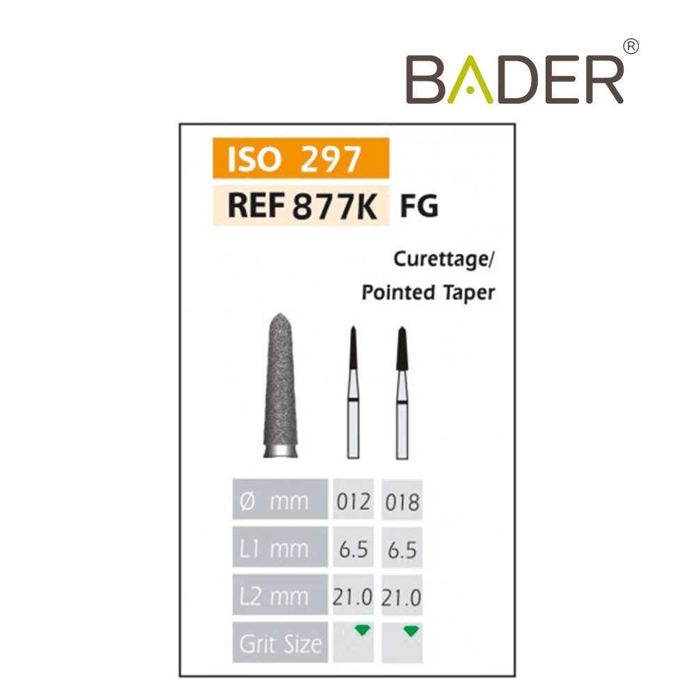 La rugosidad o el tamaño del grano de la cabeza. Es importante que al realizar su pedido nos indique el tipo de grano que desea.El tipo de rugosidad puede identificarse por el color de la fresa dental. La clasificación de rugosidades de las fresas dentales es también standard y estas son las que Bader tiene disponibles: