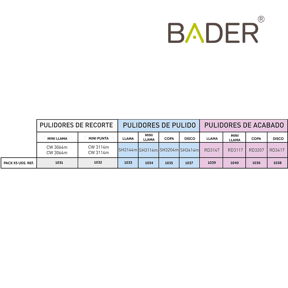 En el conjunto de pulidores de recorte (blancos), encontrarás 2 pulidores mini llama (CW 3064m) y 2 pulidores mini punta (CW 3114m). Por otro lado, el conjunto de pulidores de pulido (azules) incluye 1 pulidor llama y 1 pulidor mini llama (SH 3144m, SH 3114m), 1 pulidor diamantado copa (SH 3204m) y 1 pulidor diamantado disco (SH 3414m). Finalmente, el conjunto de pulidores de acabado (rosas) incluye 1 pulidor llama y 1 pulidor mini llama cerámica (RD 3147, RD 3117), 1 pulidor diamantado copa (RD 3207) y 1 pulidor diamantado disco (RD 3417).