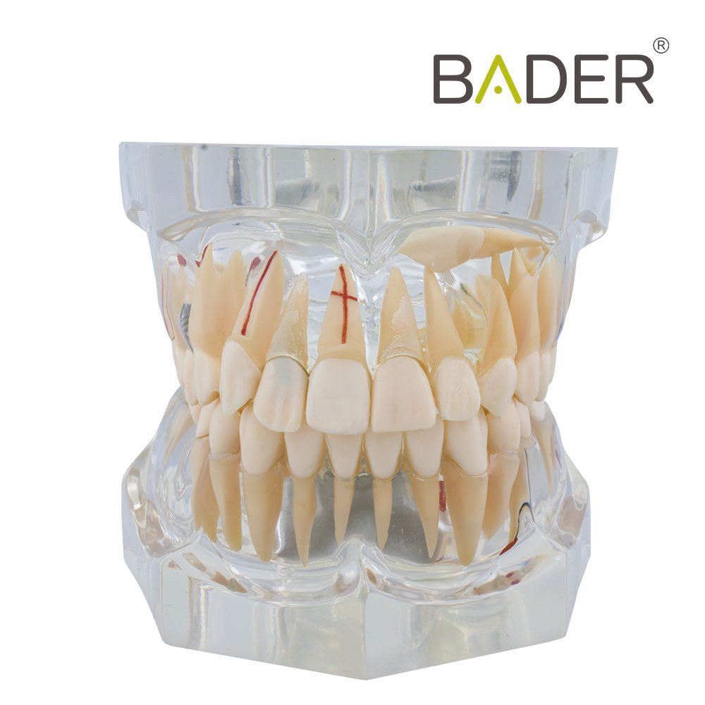 Macromodelo acrílico transparente para la demostración de una dentición de adulto con 31 dientes.